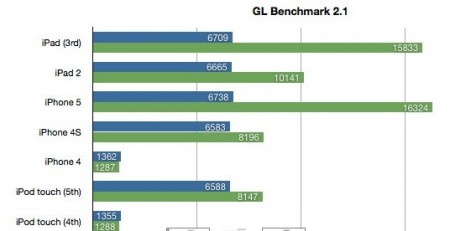 Diversamente, la GPU del nuovo iPod sembra essere poco potente in quanto il punteggio riscontrato supera solo quello dell’iPhone 4 e iPod Touch 4G; tutti gli altri dispositivi sono nettamente superiori in termini grafici.
